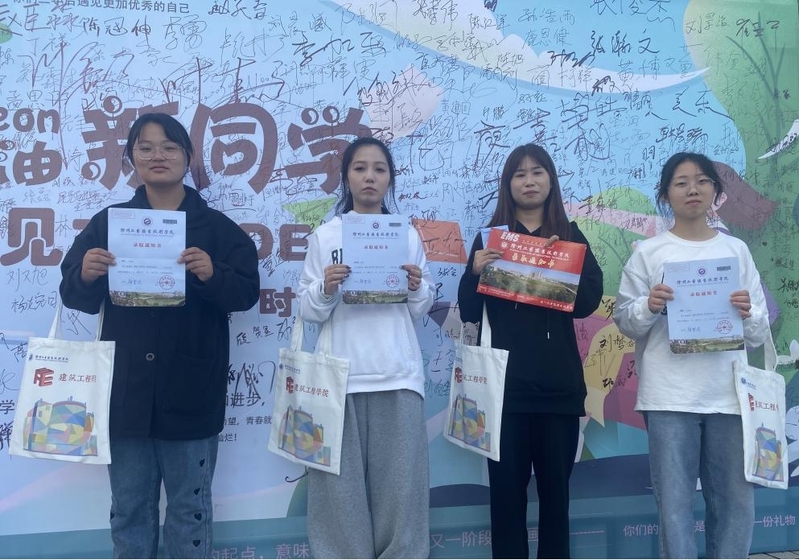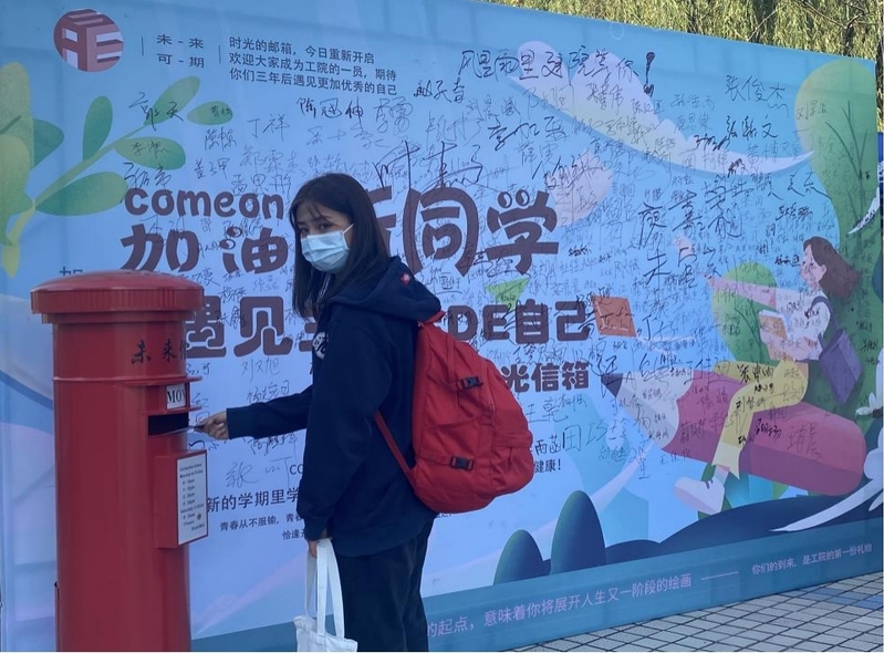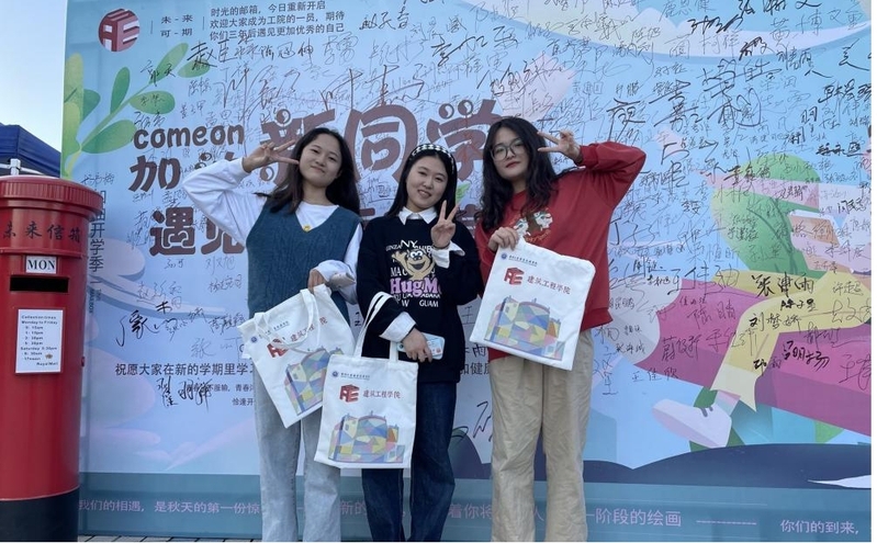 途经建筑工程学院B01楼前,设计精美的喷绘墙、精美的新生礼物、红底白字的迎新横幅无处不在表示着建筑工程学院对新鲜血液注入的殷切期待。“时光信箱”作为本次建筑工程学院迎新设计的关键词,旨在提醒学生珍惜时光,不负韶华。通过迎新签到墙以及给三年后自己的一封信来丰富新生入学的期待感,同学们在喷绘墙前合影留念,定格遇见新伙伴的珍贵瞬间,同时学院安排专人为每位同学记录专属个人瞬间,提高新同学的归属感、获得感、幸福感。