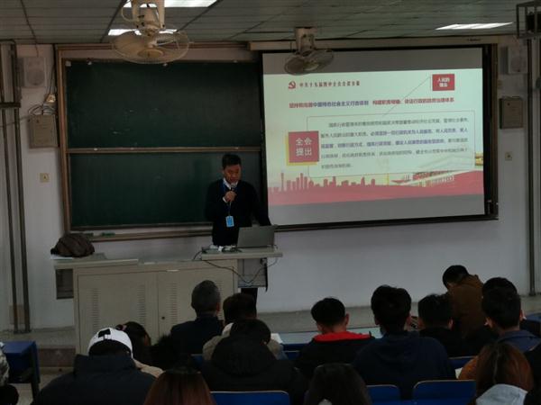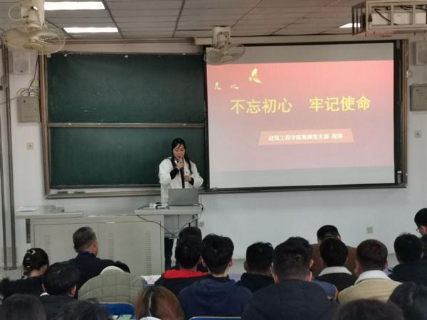 12月11日下午建筑工程学院程建伟院长结合“不忘初心、牢记使命”主题教育,以互动交流、提问解答的方式为师生讲专题党课,宣讲党的十九届四中全会精神。